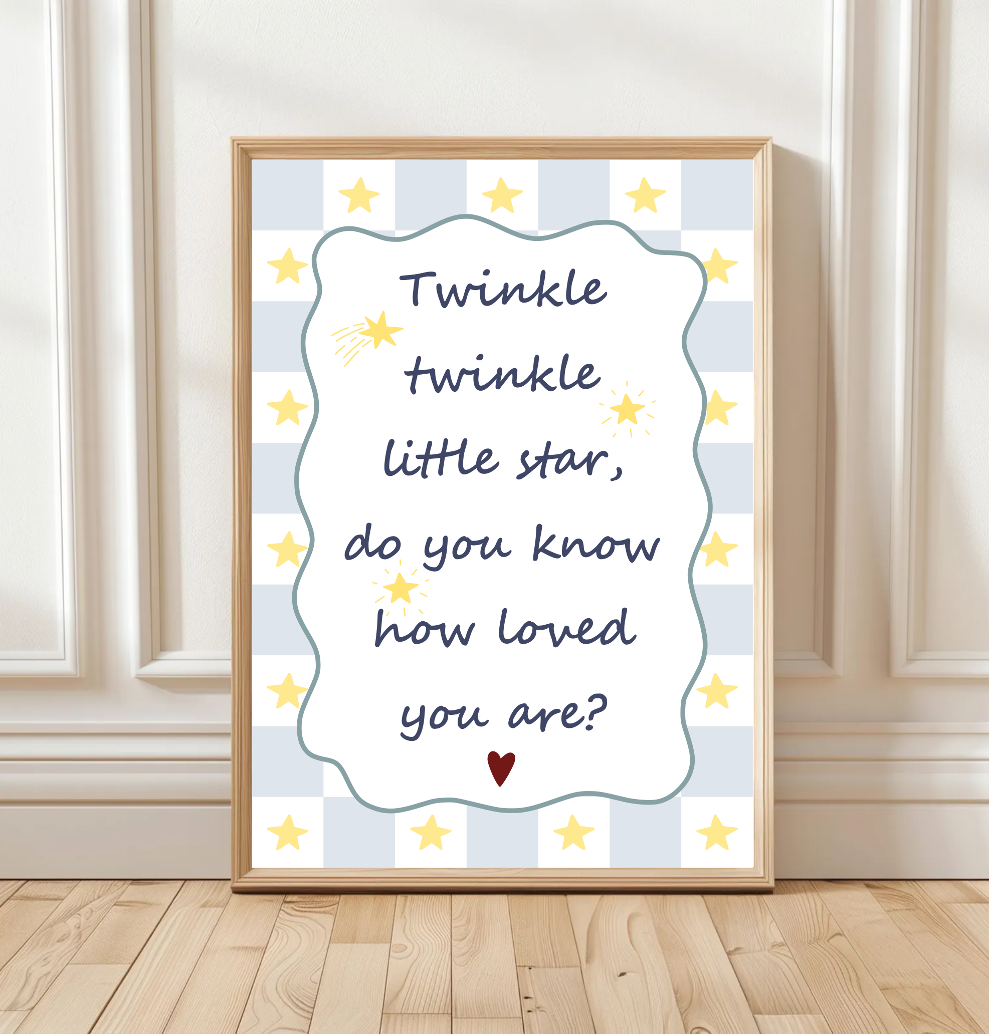 Add a touch of magic to your little one’s room with this sweet “Twinkle twinkle little star, do you know how loved you are?” print. Designed in my cosy Perthshire studio, this A4 poster features a soft starry border, gentle colours and a heartfelt message that wraps children in love and reassurance.